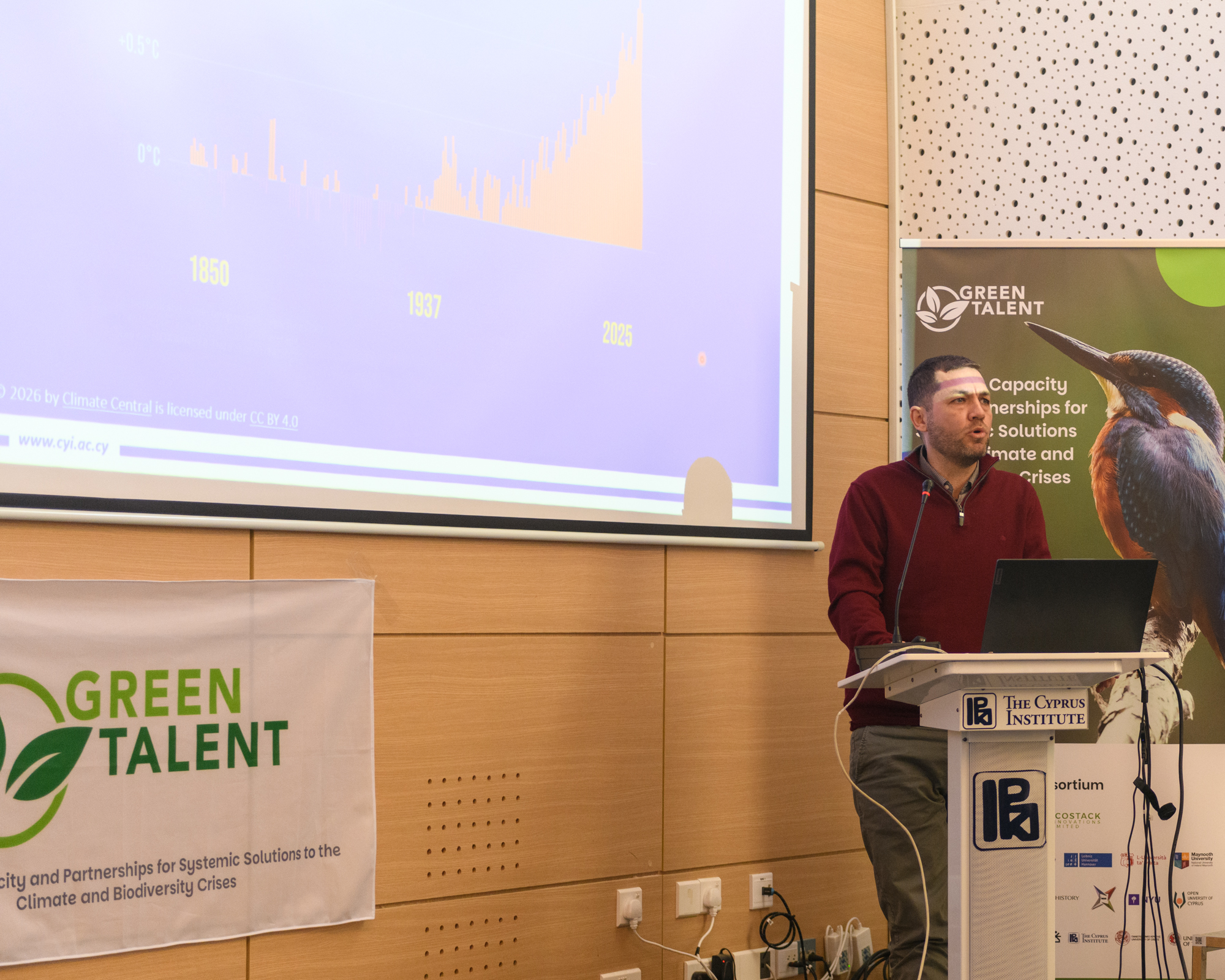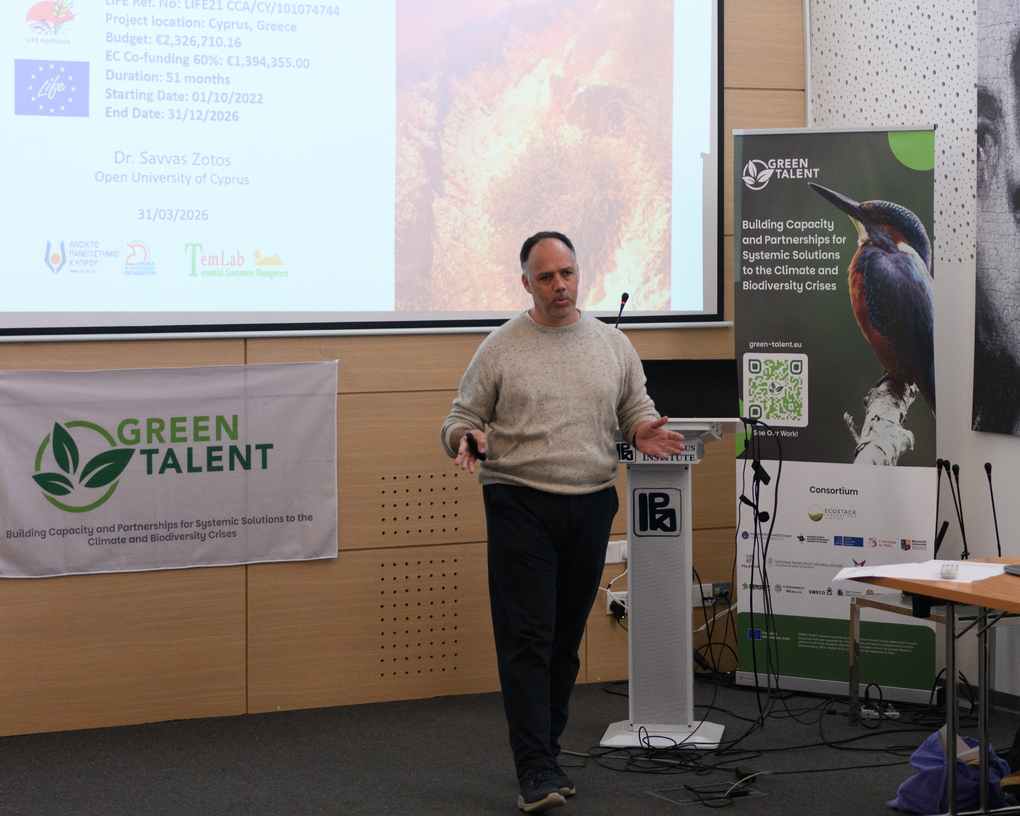 Dr. Savvas Zotos, a senior researcher at the Open University of Cyprus, delivered a presentation highlighting the role of regenerative agriculture for soil and ecosystem resilience enhancement. Dr. Vasilis Litskas, founder of VL Sustainability Metrics Ltd., shared more insights on restoration opportunities of abandoned municipal land and how to engage local communities in exploiting those lands for sustainable food production. As part of the agenda, Dr. George Zittis, a research scientist at the Cyprus Institute, explored past trends, future projections, and societal-ecological impacts driven by climate change in Cyprus. Cleo Yiangou, Innovation Officer at the Cyprus Institute, introduced the Needs Assessment Tool and the Green Talent Questionnaires, all part of WP2.
